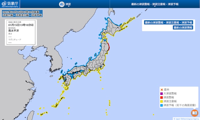 津波予報 2022年1月16日午前11時20分 気象庁発表 津波注意報に切り替えました. 津波予報津波に関するその他の情報 平成30年12月 5日16時14分 気象庁発表 津波予報若干の海面変動をお知らせします 本文 若干の海面変動が予想される沿岸は次のとおりです 津波予報若干の海面変動. 気象庁は津波警報注意報を発表すると 全国の沿岸を66に分けた 津波予報区 ごとに 予想される津波の高さと到達予想時刻をお知らせしています これらの津波予報区は地形により異なる津波の現れ方の特徴を調査した上で 警報注意報が発表されたときの自治体などの関係防災機関での緊急対応も考慮して設定されています ここでは気象庁がどのようにして予報.
